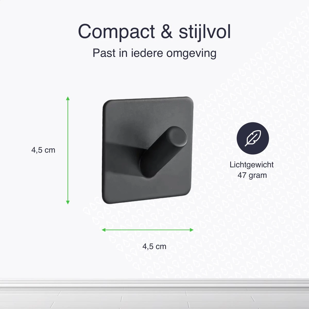 Het design van de haakjes, die 45 bij 45 mm zijn, is simpel en strak. Doordat de haakjes van zwart roestvast staal gemaakt zijn, hebben ze de perfecte look voor bij een modern interieur. Maar ook zijn de haakjes uitstekend te combineren met interieurs die veel industriële elementen hebben.