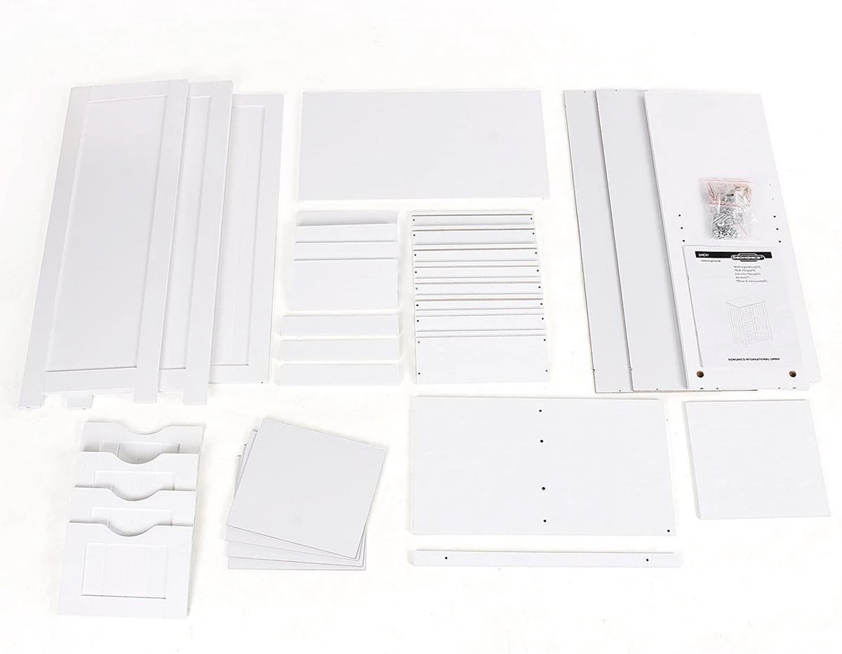 - Alle planken zijn dubbelzijdig gelakt, de verf is gelijkmatig verdeeld over de gladde ondergrond. De beklede laden bieden veel opbergruimte voor verschillende voorwerpen zodat alles mooi kan worden gesorteerd en opgeruimd. Daarnaast zijn er voor alle schuifladen nog kunststof plankjes die je op de dwarsbalk bevestigt om te vermijden dat de laden bij het uitschuiven uit de kast worden getrokken.