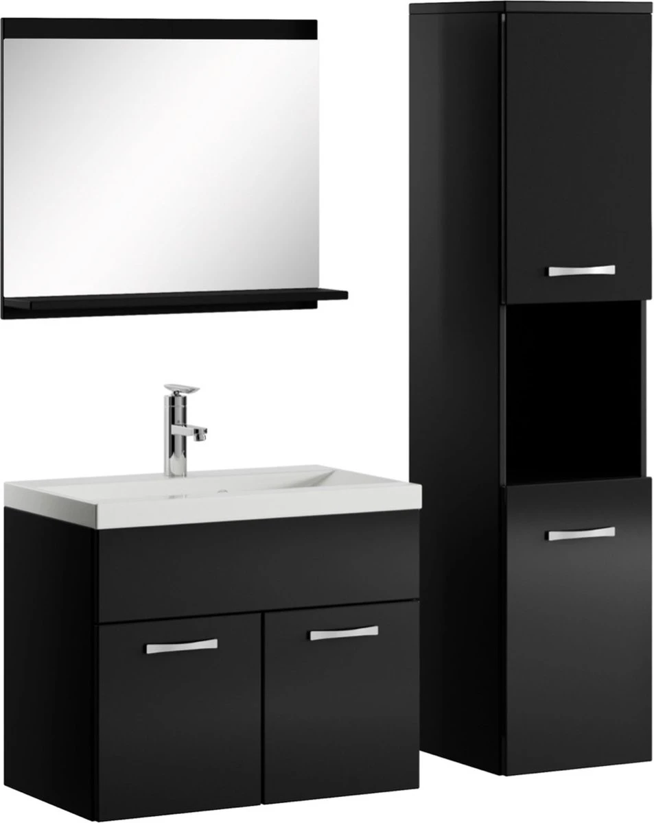 Vanwege zijn strakke afwerking is het meubel gemakkelijk schoon te maken. De set is volledig uitgevoerd in zwart met hoogglans frontjes en is gemakkelijk te monteren.