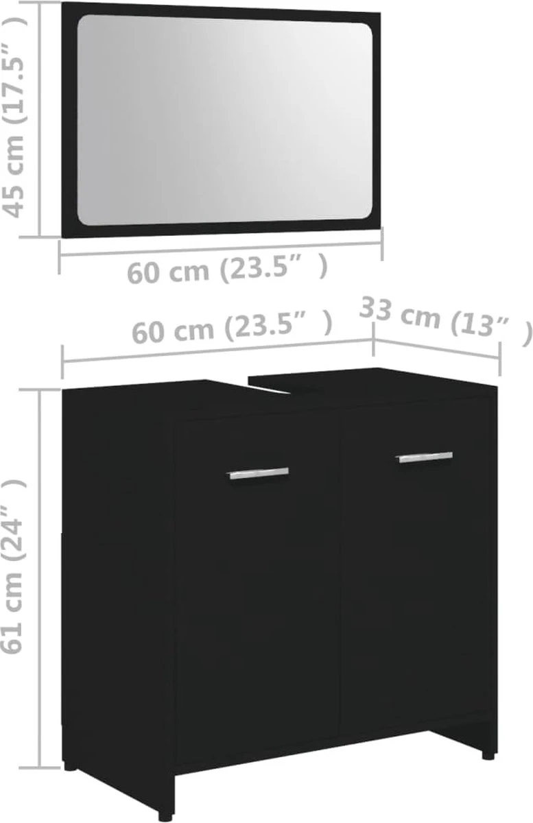 De meubelset, bestaande uit een spiegel en een kast, is gemaakt van duurzaam en stabiel spaanplaat. De chique kast is voorzien van 1 vak en 2 deuren en biedt voldoende opbergruimte om spullen in je badkamer op te bergen. Elke deur heeft een handvat voor gemakkelijk openen en sluiten. De spiegel geeft je interieur een prachtige uitstraling. Deze badkamerset is gemakkelijk schoon te maken met een vochtige doek.