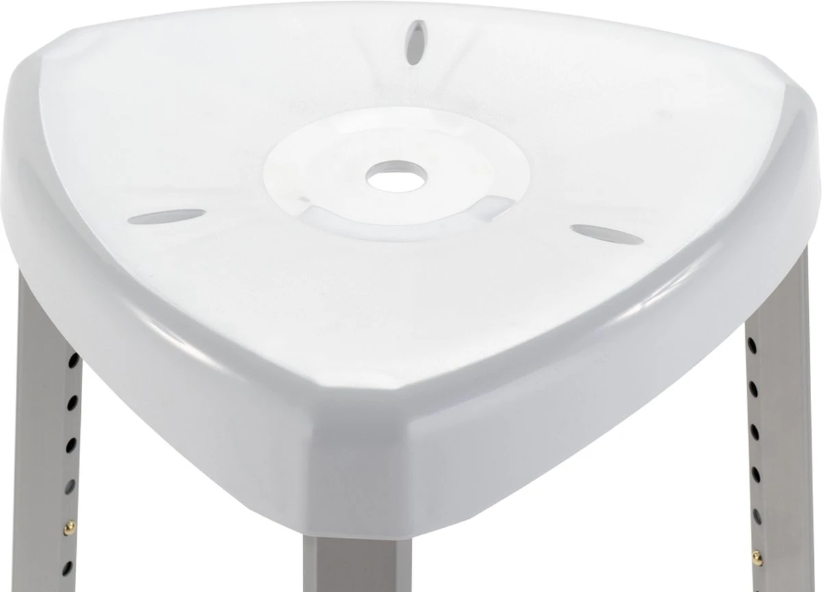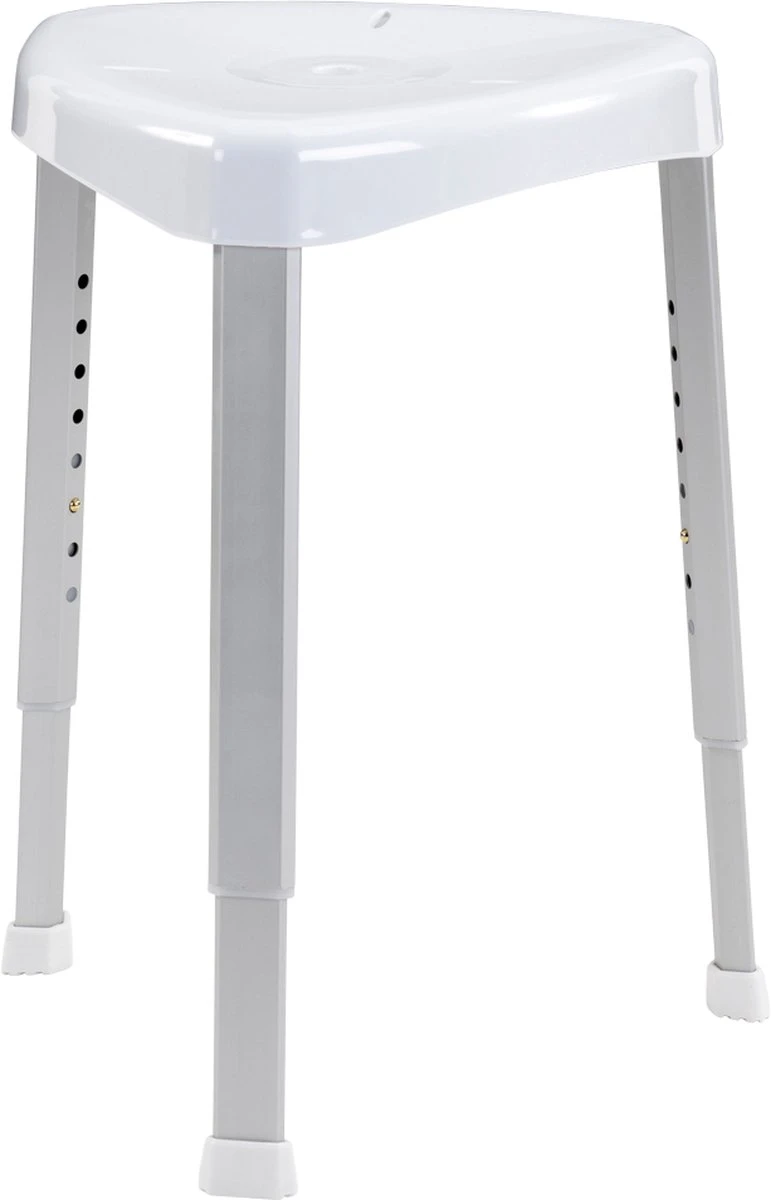 Hoek douchekruk met een mooi design die in hoogte verstelbaar is van 45 cm tot 56 cm, zo kunt u de juiste zithoogte zelf bepalen. Door de vorm van het douchekrukje past deze perfect in de hoek van een douche en neemt daardoor bijzonder weinig ruimte in.