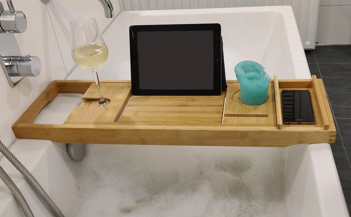 De bamboe badbrug is voorzien van onder andere een tablethouder / boekhouder, waardoor u ontspannen in bad kunt genieten van een boek of een serie. Daarnaast heeft de badplank een glazen houder en kaarsenhouder om helemaal tot ontspanning te kunnen komen. Verder heeft de badbrug nog een opbergvak voor bijvoorbeeld een telefoon, zeep of scheermes.