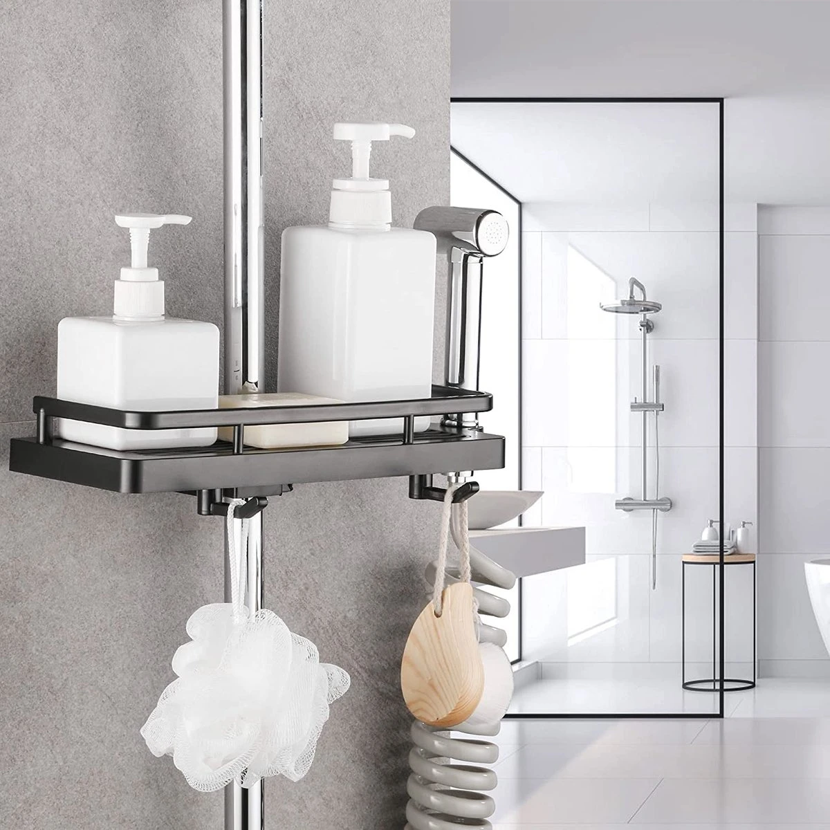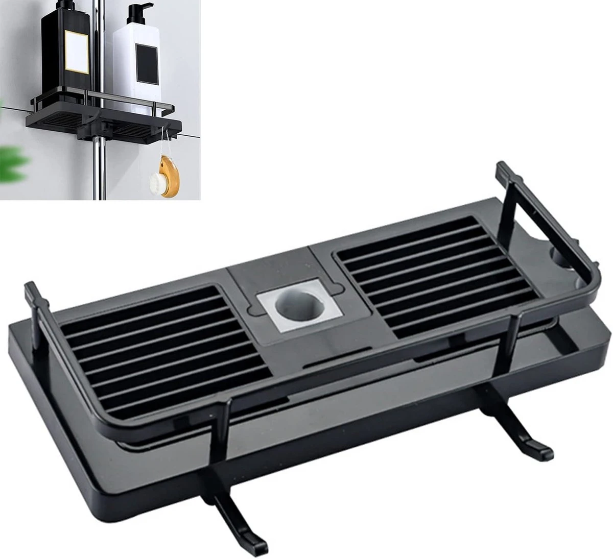 - Eenvoudige installatie: snelle en eenvoudige installatie zonder boren. De afneembare bodemplaat helpt om het droog en schoon te houden. Door de verstelbare klem voor iedere douchestang geschikt.