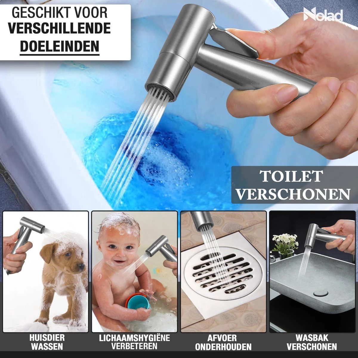 Een blikvanger in iedere badkamer! Breng je badkamer tot leven met deze prachtige prachtige bidet. Deze bidet is onderdeel van de Nolad® | Elite Pure Silver Collection 2022 uitgevoerd in de kleur zilver met een toplaag van RVS en is past hierdoor in ieder interieur. Zilver is erg populair en zelfs een gewone en vaak saaie ruimte gaat met deze prachtige bidet opleven. Of je nu een harde waterstraal wilt, of een zachte, met de Nolad® bidet handdouche kun je dit eenvoudig regelen. De hendel van de bidet handdouche is moeiteloos te bedienen en de waterdruk is te variëren in hoeverre je de hendel indrukt. Daarnaast is de bidet eenvoudig te bevestigen dankzij de Nederlandse gebruiksaanwijzing en zijn de bevestigingsmaterialen amper zichtbaar. Bestel vandaag nog de bidet handdouche en creëer de finishing touch aan in jouw badkamer, toilet of keuken!