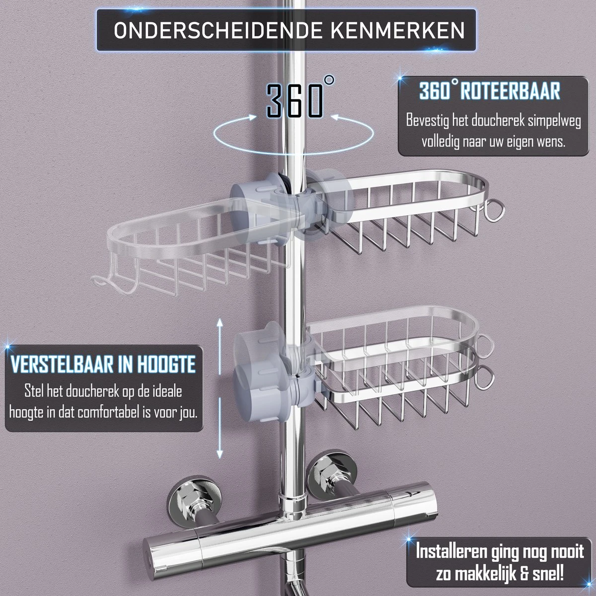 Met dit complete doucherek worden alle onderdelen meegeleverd om het doucherek snel en eenvoudig te monteren. Dankzij de super stevige klem blijft ons doucherek heel goed zitten. Geen gedoe met boren en zo voorkom je beschadigingen en gaten in de muur. Ook zonder een dure monteur kun je dit doucherek zelf binnen een handomdraai installeren. Dankzij de Nederlandse handleiding is dit een fluitje van een cent. Binnen enkele minuten hangt u het doucherek eenvoudig op aan uw muur.