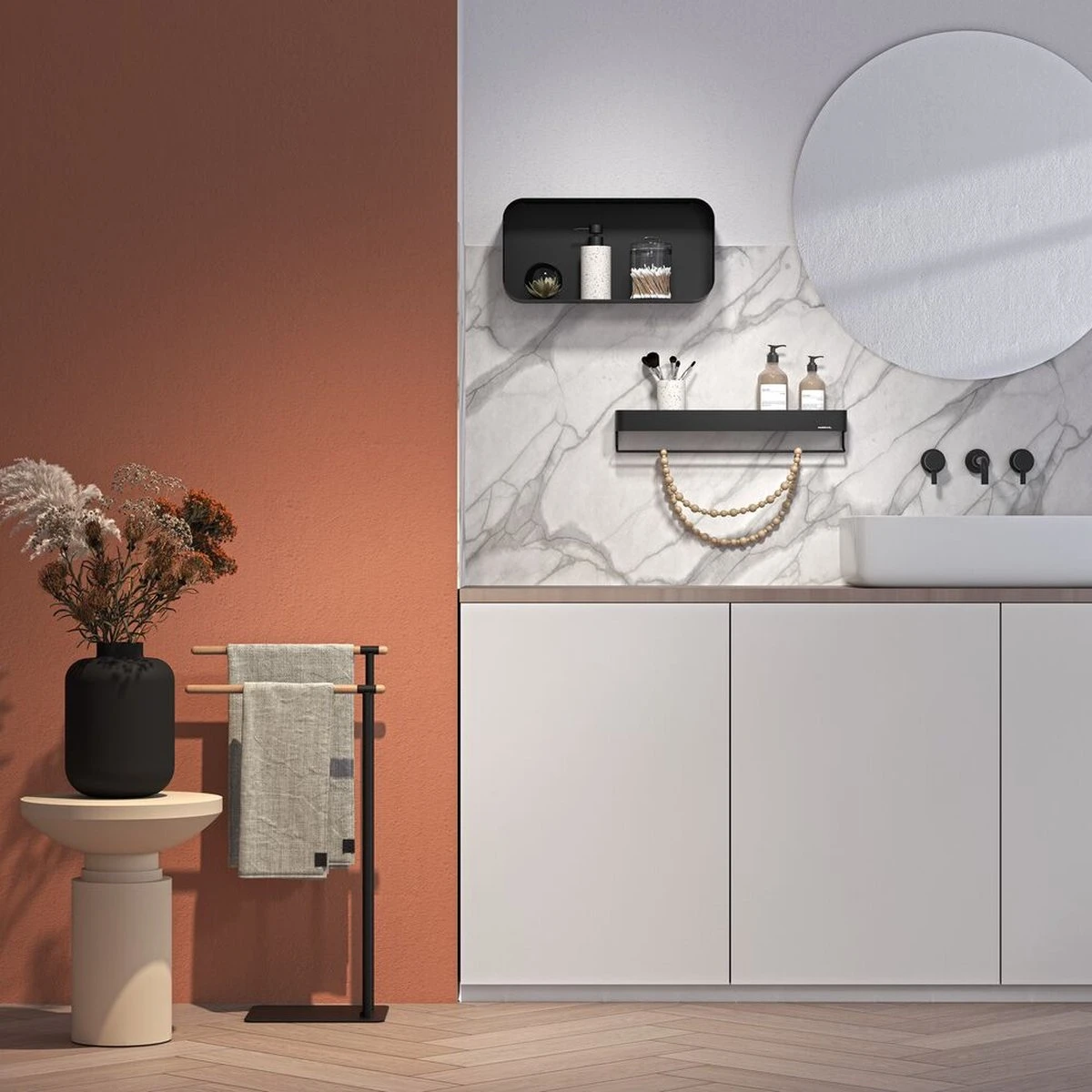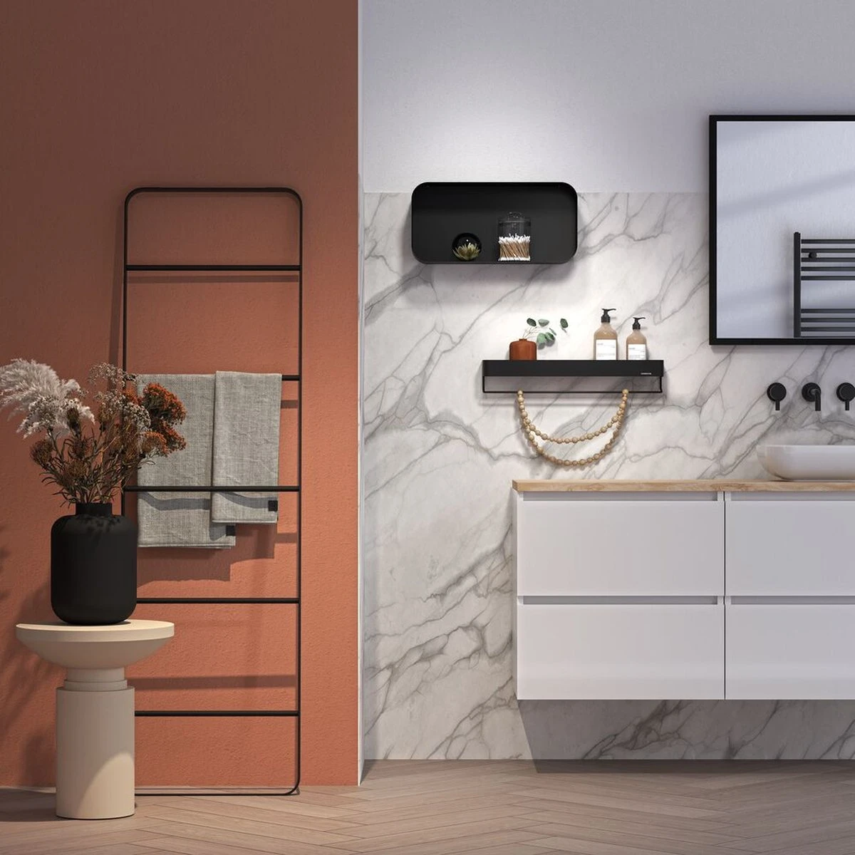 Alles voor een opgeruimde badkamer. Met dit zwart metalen wanddrek uit de Brix-serie van Sealskin kun je al jouw favoriete items een mooi plekje geven. Dankzij de rails onder de plank kun je ook diverse handdoeken kwijt. Niet alleen leuk te stylen in je badkamer of toilet, maar ook in je keuken! Echt een must have item.