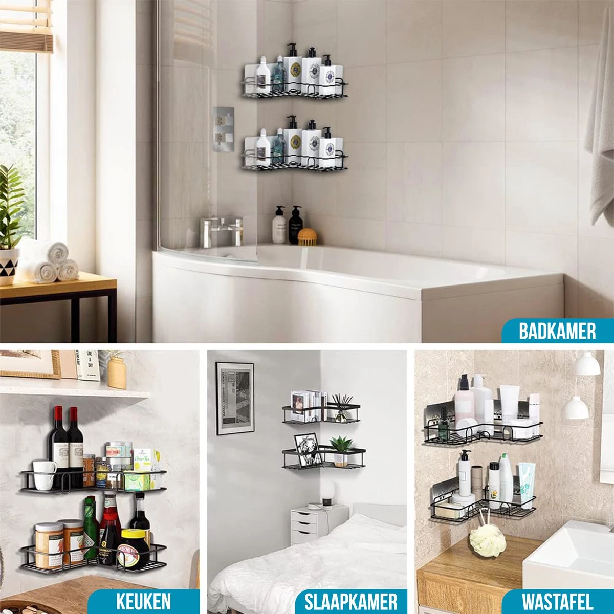 Wil jij jouw douchespullen netjes opbergen zonder gaten in de muur? Dan is een zelfklevend badkamerrek perfect voor in jouw douche! Onze doucherek set is bevestigd binnen 1 minuut, bevat een handige rand, wat zorgt voor extra gemak omdat je flessen niet kunnen omvallen en biedt genoeg ruimte voor al jouw bad spullen. Met sterk RVS materiaal en een draagkracht van 10 kg staat jouw nieuwe en stijlvolle badkamerrek stevig, zonder boor of schroef.