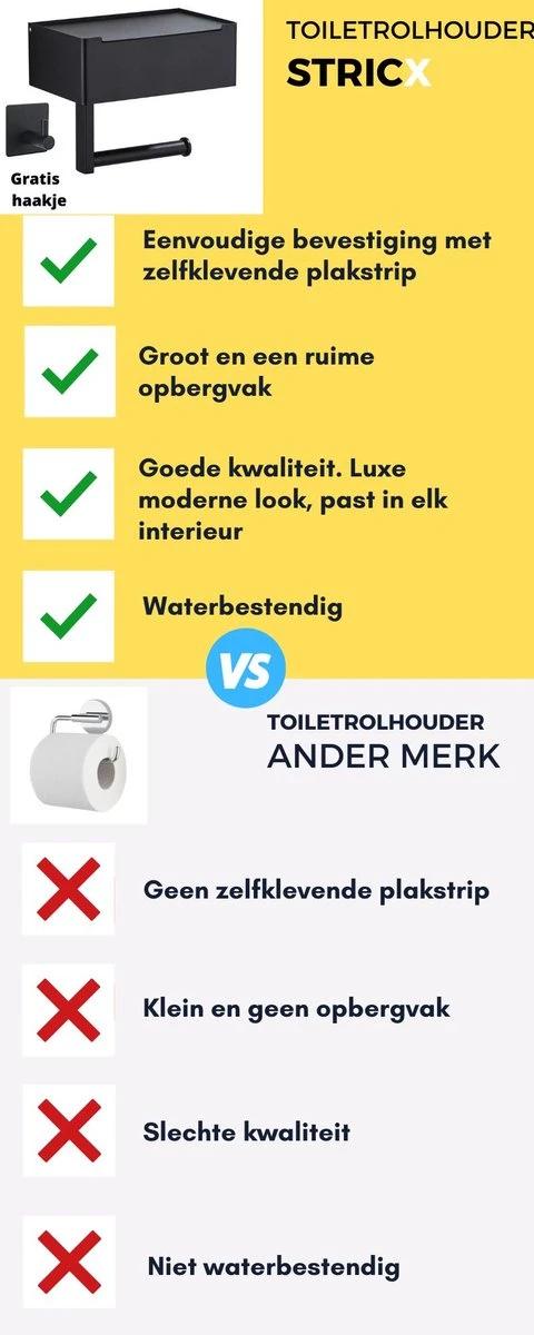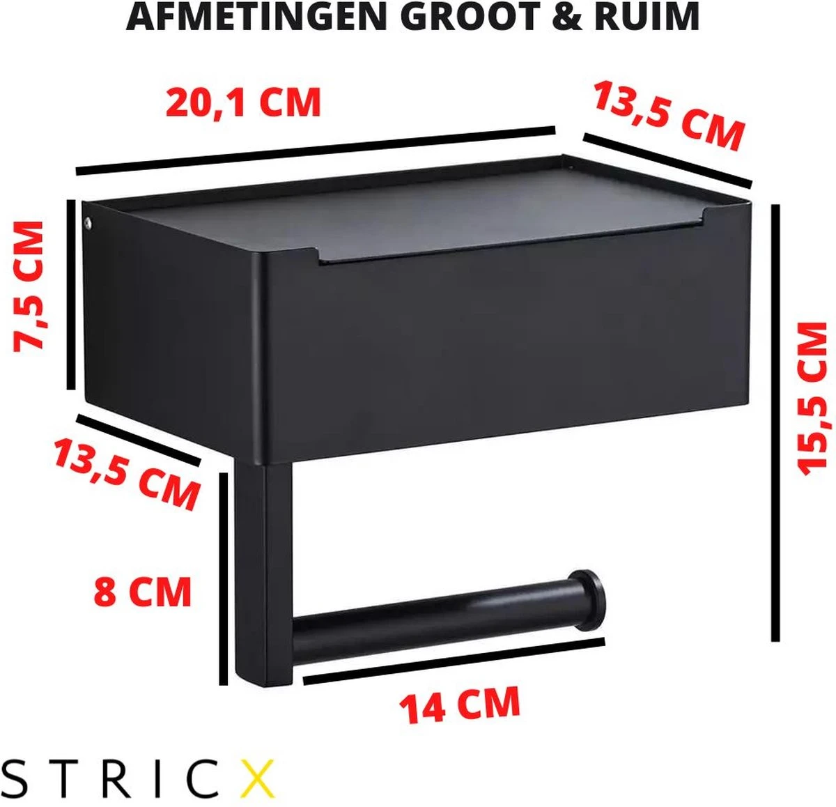 Het oog wil ook wat, bestel daarom de unieke WC rolhouder van STRICX! Het goed doordachte design van de toiletrolhouder met opbergvak is ideaal voor onder andere babydoekjes, natte wipes, hygiëne producten en nog veel meer! Het plankje kan dienen als telefoonhouder of voor decoratiestukken als een geurkaars. De luxe toilet rol houder met tissue box kan simpel bevestigd worden met de bijgeleverde zelfklevende plakstrip, zonder te boren dus! Jouw huis is een thuis met STRICX!