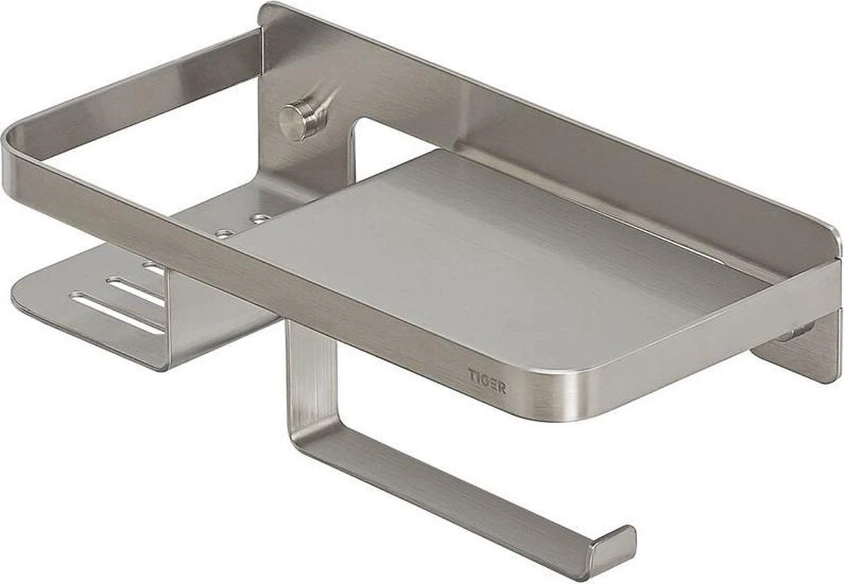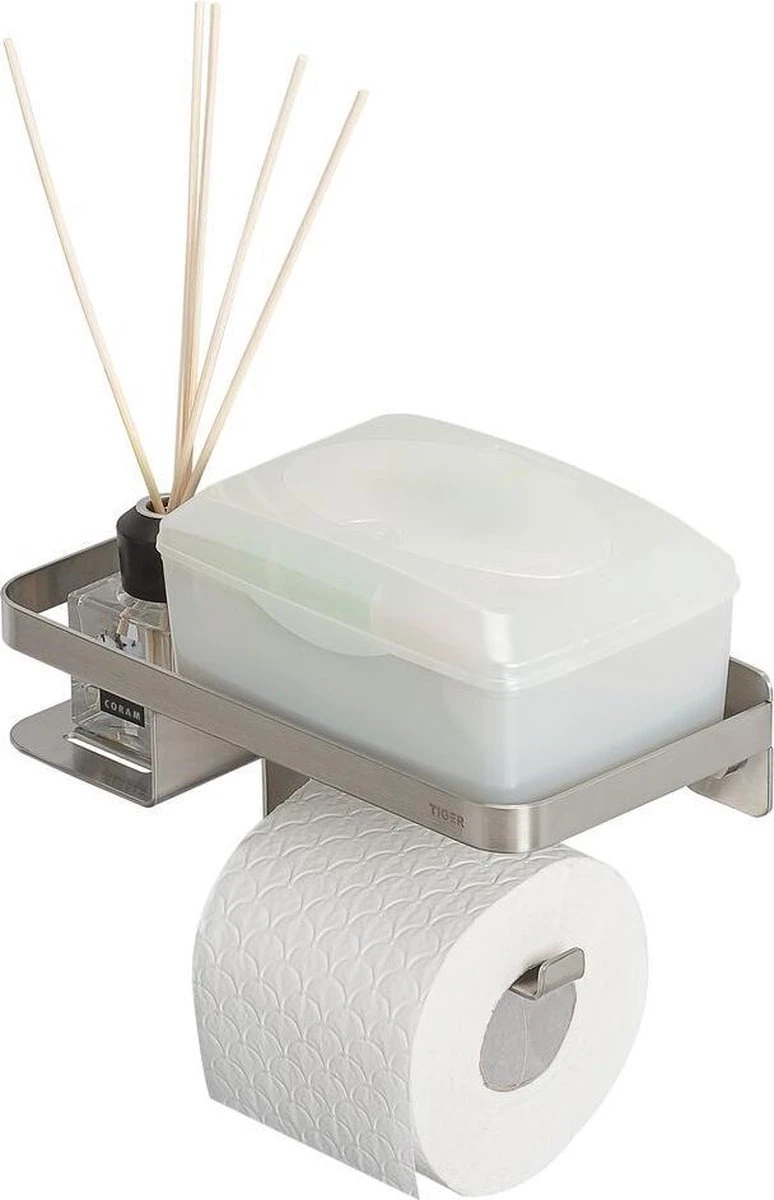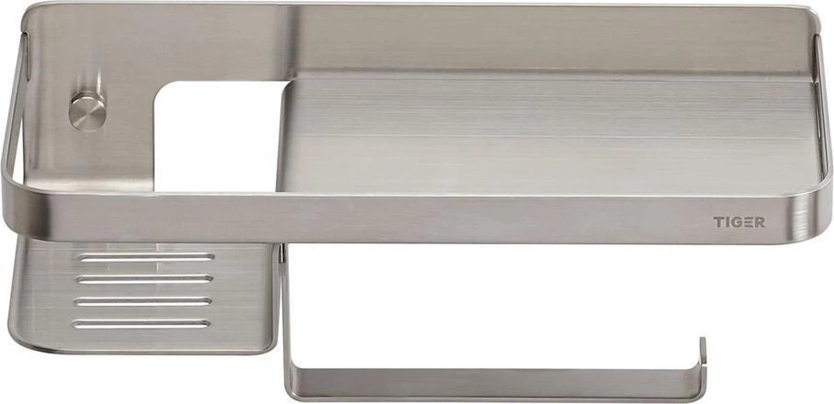 Je zit in één keer goed met deze unieke Tiger Caddy toiletrolhouder met planchet. Deze alles-in-1 toiletoplossing biedt ruimte voor geurstokjes, je mobiele telefoon, vochtig toiletpapier of zelfs een opbergdoosje voor hygiëne producten voor dames. Hij is de Houdini onder de badkameraccessoires, maar met de nieuwe Caddy is een opgeruimde badkamer geen illusie. Breng ook het tijdloze gevoel naar jouw badkamer met deze RVS variant.
