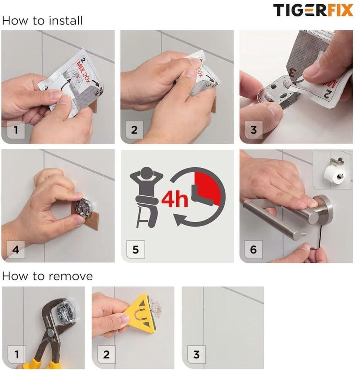 Wil je geen gaten boren in je nieuwe badkamertegels, zeker niet in natuursteen of grote tegels? Dan is TigerFix de oplossing. Deze gepatenteerde manier van monteren garandeert een zeer krachtige lijmverbinding op iedere gladde, stevige ondergrond. Groot voordeel van TigerFix is dat het muurplaatje eenvoudig, zonder beschadigingen, te verwijderen is. Handig bij huurwoningen, verhuizen of gewoon wanneer je accessoires wilt verplaatsen.