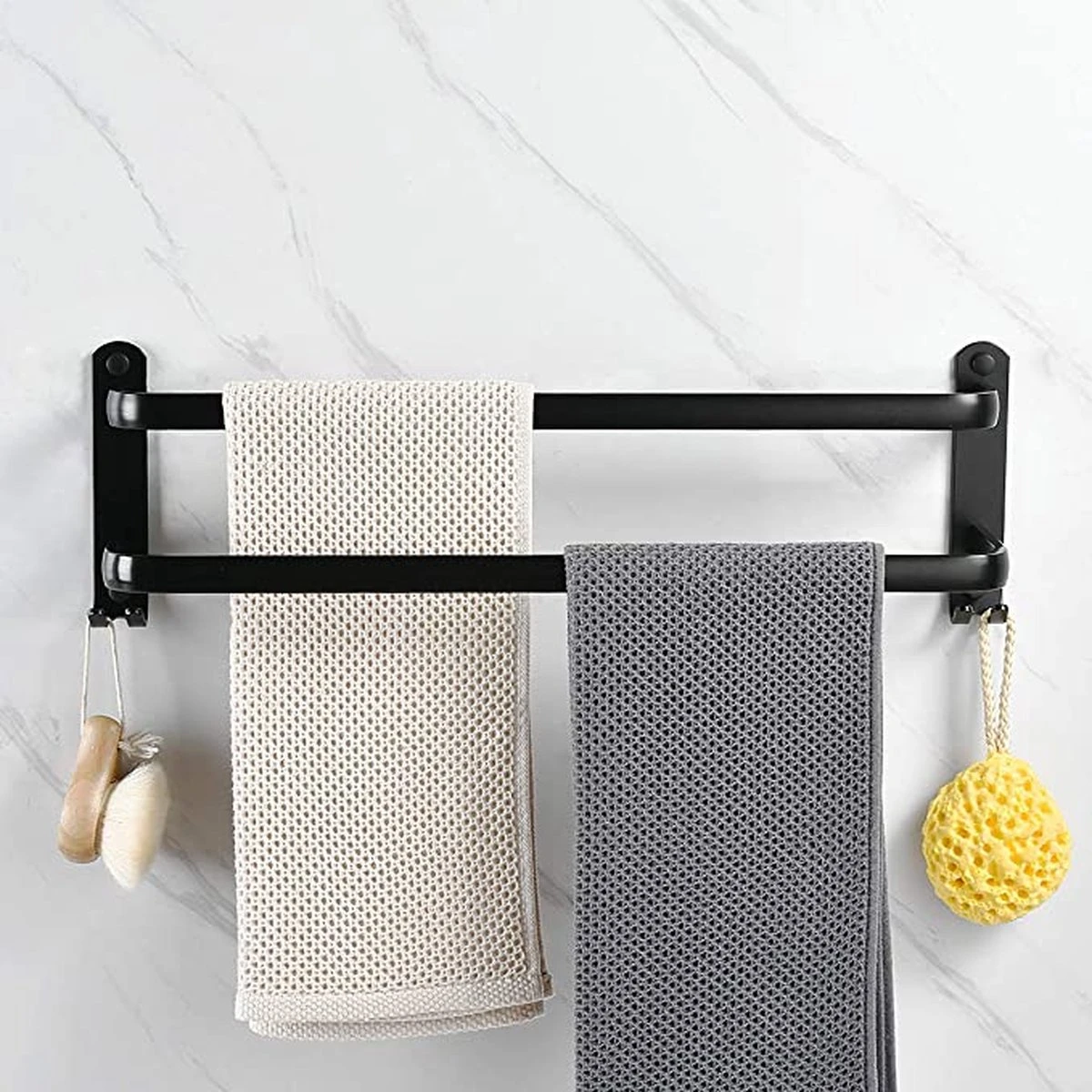 De twee stangen hebben voldoende tussenruimte zodat de natte handddoeken niet tegen elkaar aan hangen en ze goed kunnen drogen.