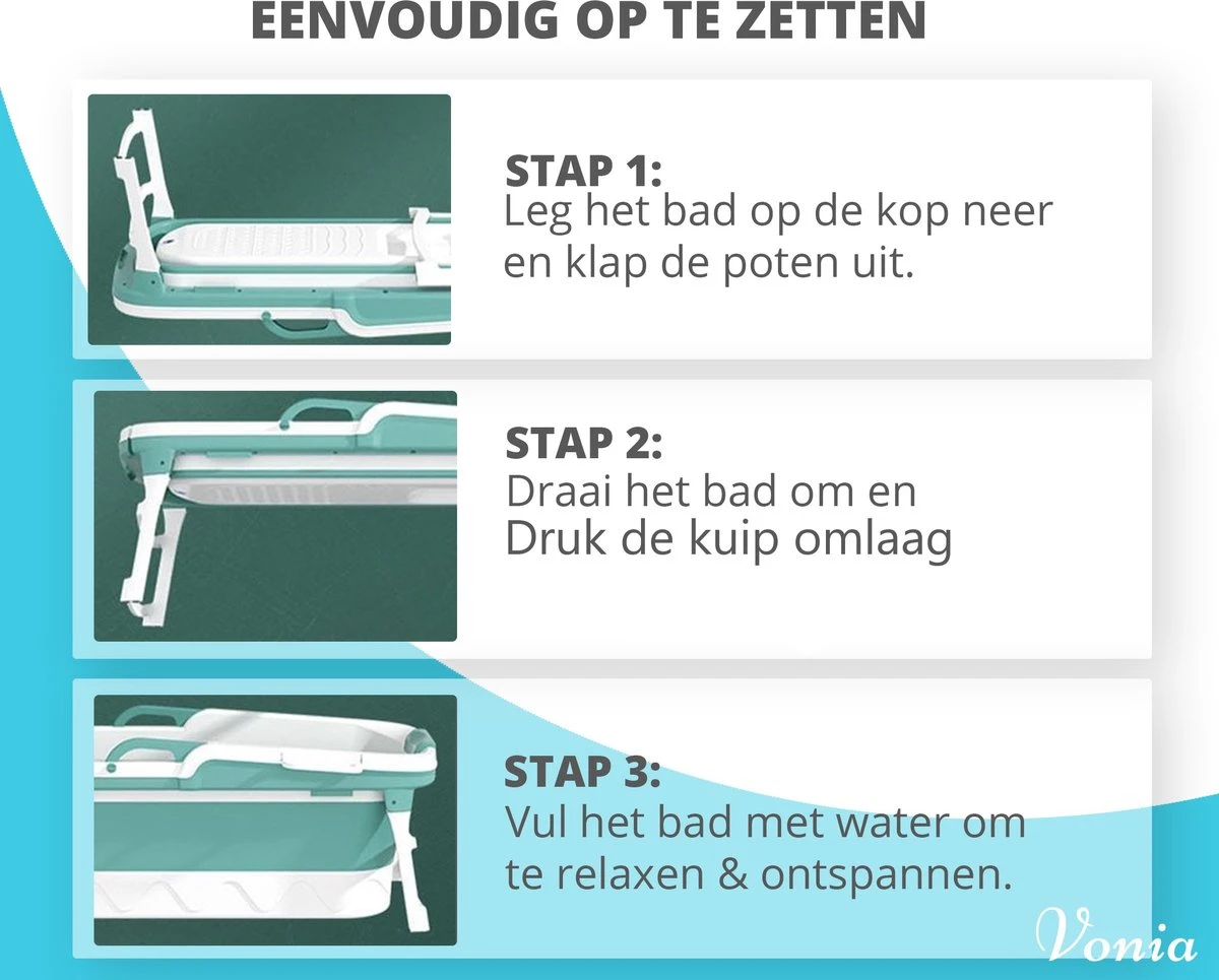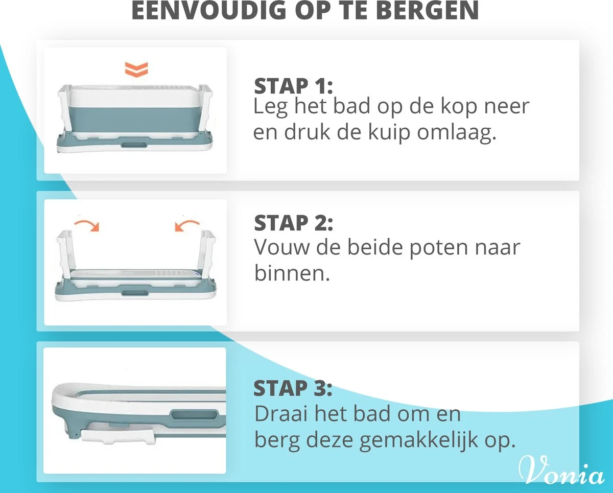 Een luxe ligbad die toch gemakkelijk is op te bergen? Niet elke badkamer beschikt over genoeg ruimte voor een douche én een bad. Je eigen bad lijkt dan al gauw een overbodige luxe, maar dit hoeft niet zo te zijn. Dit bad van Vonia is heel simpel op te zetten en na gebruik weer plat op te vouwen, waardoor het slechts 20cm hoog is. Zo neemt het bad bijna geen ruimte in beslag, is gemakkelijk op te bergen en is geschikt voor kleinere badkamers. Zo heb je alleen de lusten, maar niet de lasten van jouw bad!