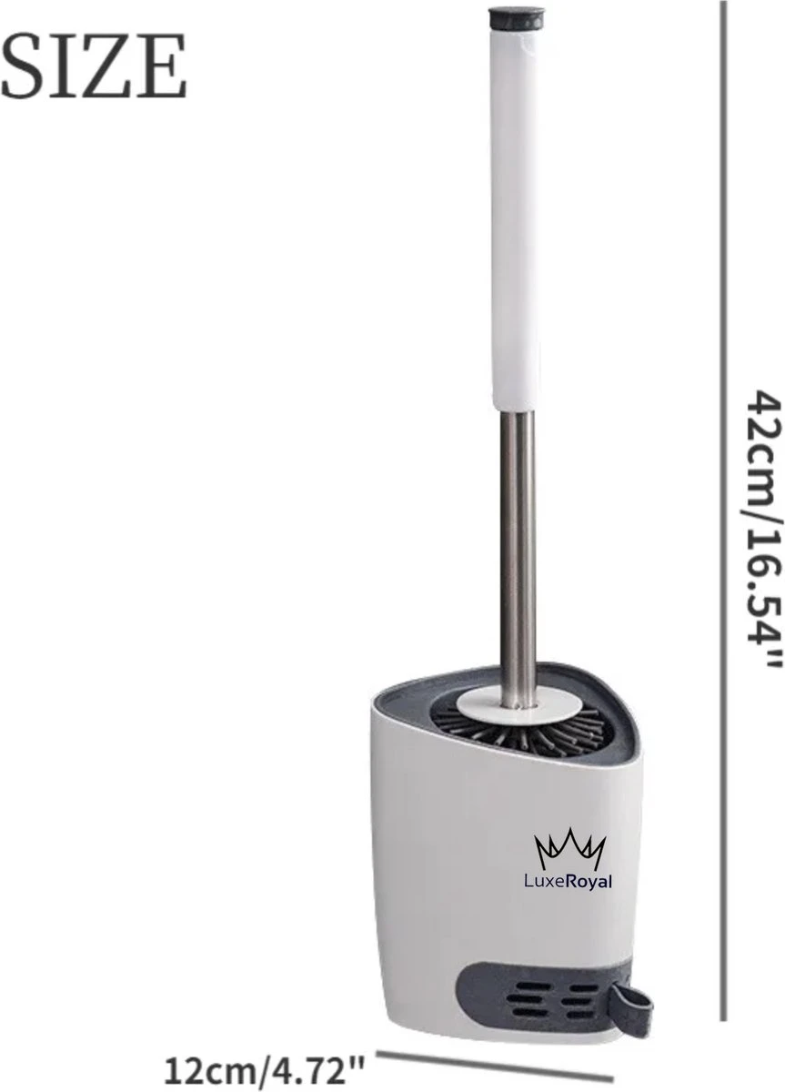 De toiletborstelhouder heeft een gleuf aan de zijkant en aan de houder zit een zelfklevende haak waarmee deze aan de muur kan worden bevestigd. De compacte toiletborstel en houder kunnen ook op de grond blijven staan als u dit prefereert. Het is uw vrije keuze! De LuxeRoyal toiletborstelhouder heeft een verborgen ventilatieontwerp, waardoor hij handig kan worden gereinigd, gedroogd en afgevoerd. Het ontwerp van de houder en borstel zijn strak waardoor hij mooi in uw toilet of badkamer staat.