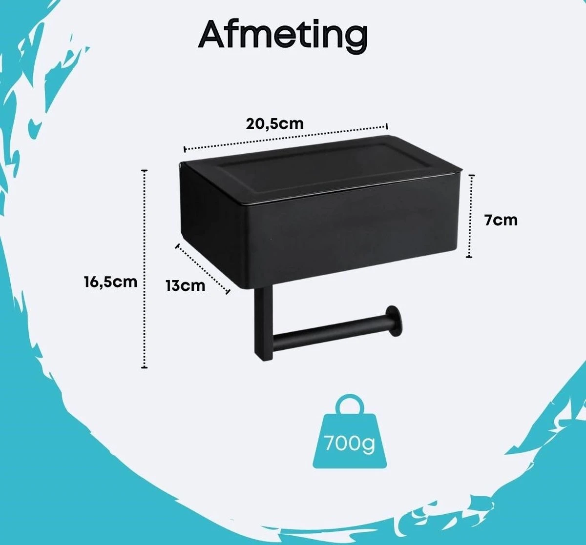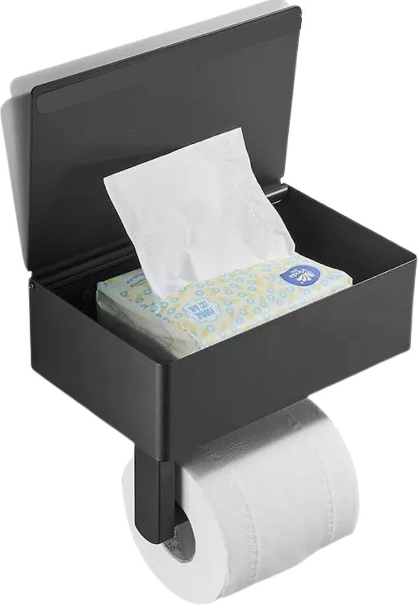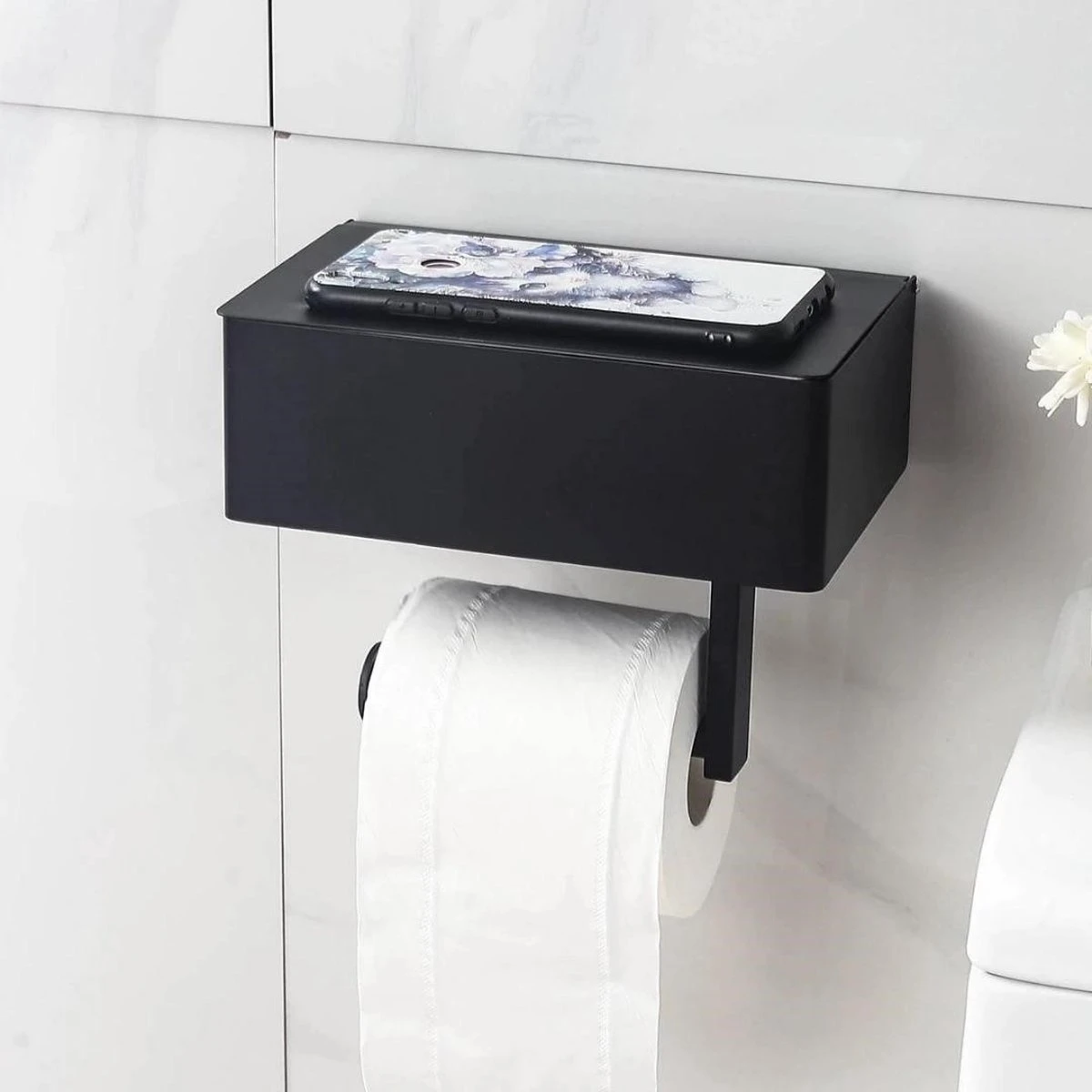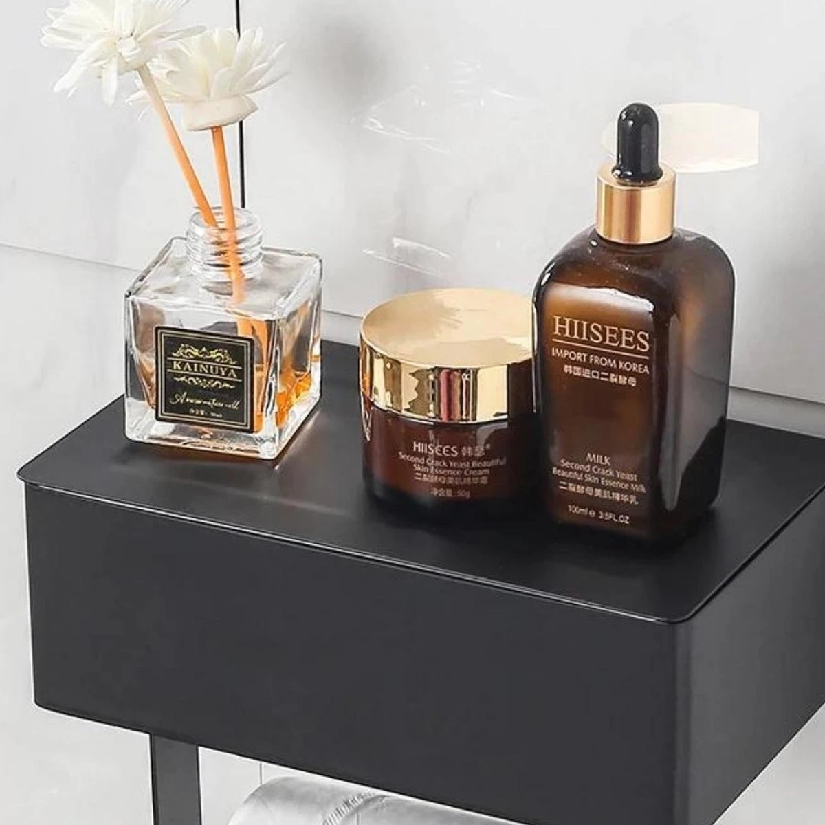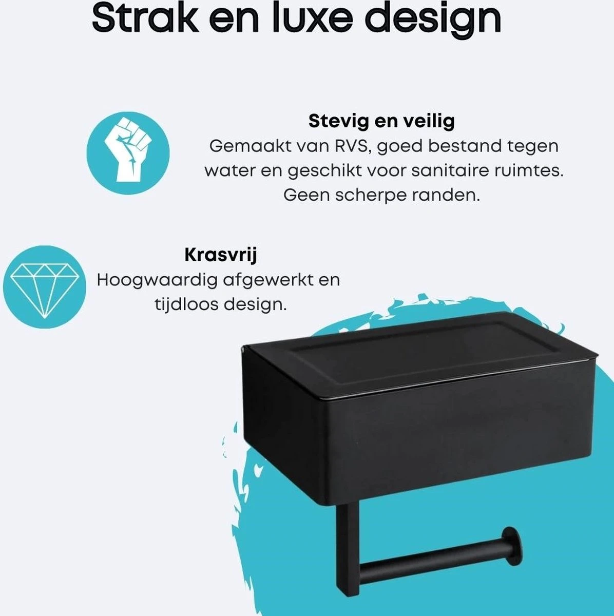 WC Rolhouder – Toiletrolhouder – Zwart – RVS – Zonder Boren – Met Plankje & Bakje – Inclusief Montagemateriaal – Toilet Accessoires – EJC Products